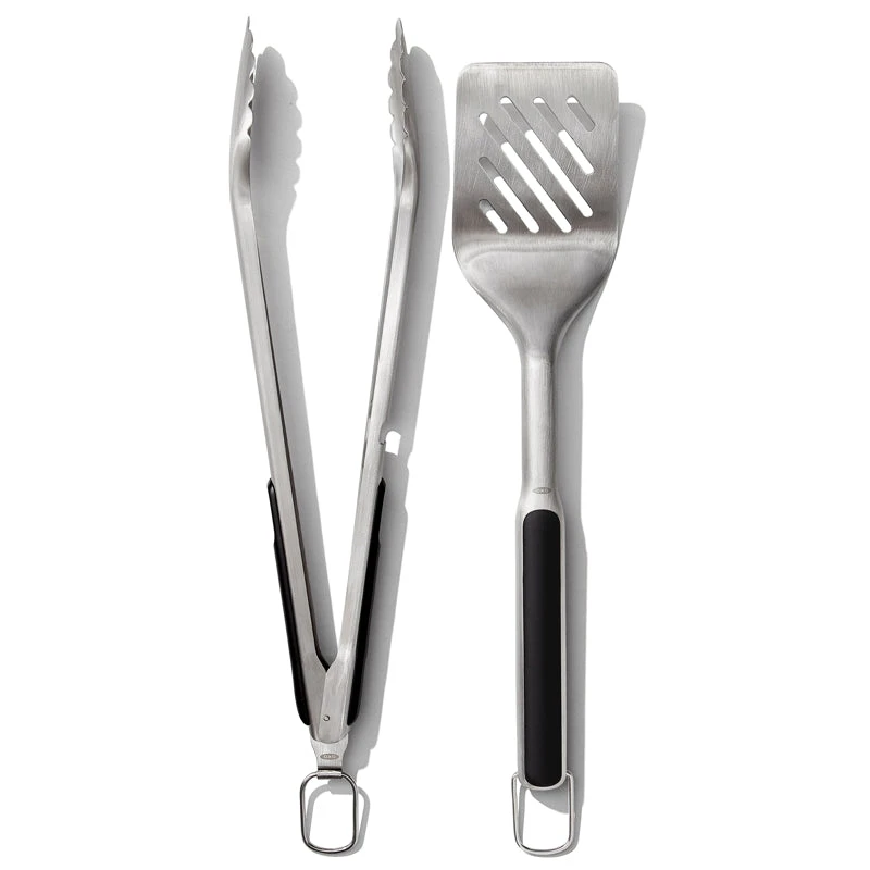 - This sturdy stainless steel set includes a turner and tongs and features soft, comfortable handles that are extra long to keep flames at a distance.