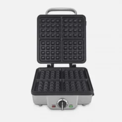 Includes a set of 4-slice Belgian waffle plates and a 4-slot pancake plate