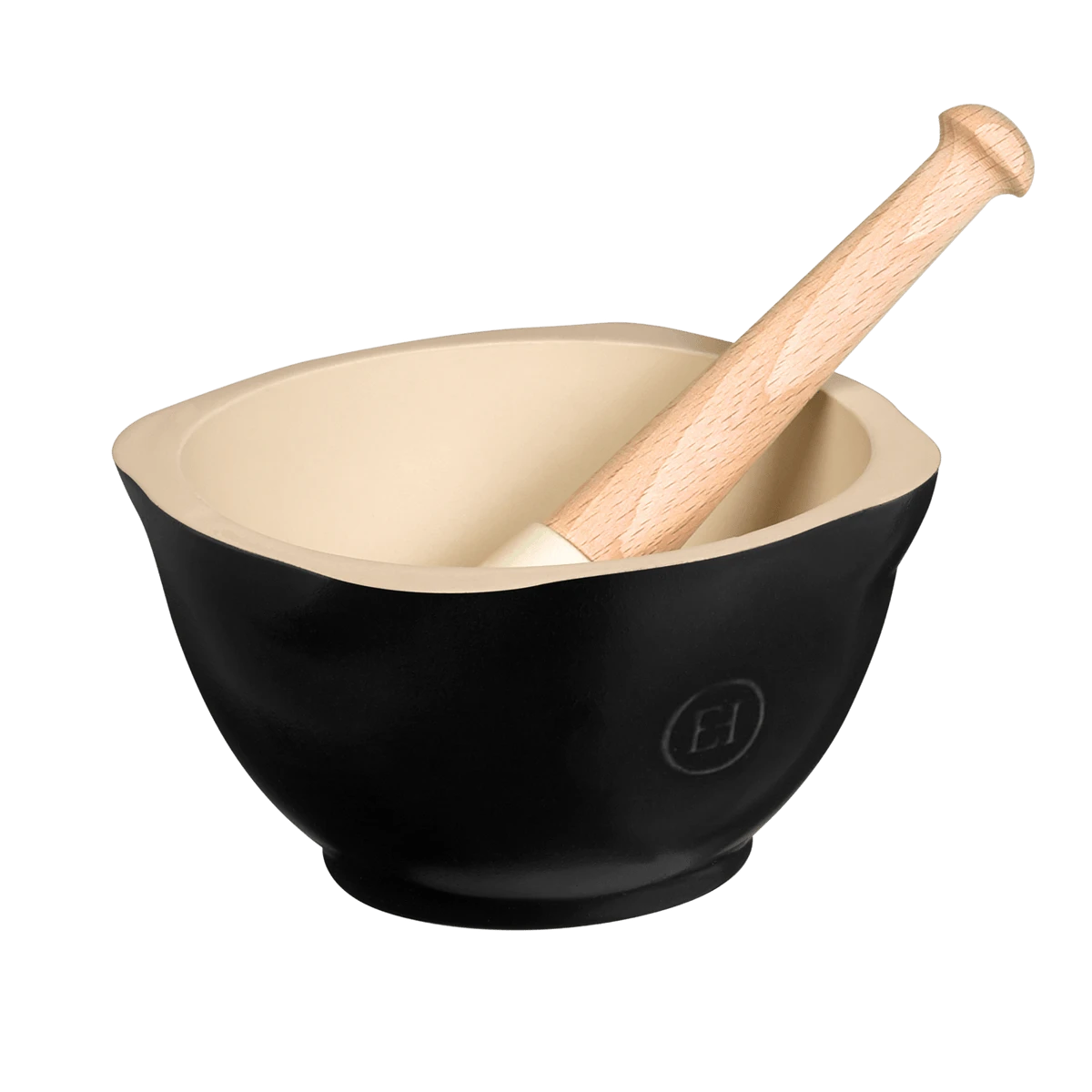 The Emile Henry Mortar & Pestle helps you prepare spice blends, spreads, sauces, and dips quickly and easily, the old fashioned way. The inside glaze has been specially created so the ingredients do not slip about, it does not stain or retain any odors. Its 4 rounded edges make it easy to handle. The pestle is made from beech wood, with a ceramic head.