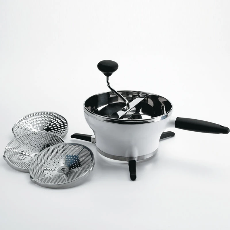 - Food Mill, with 3 disks, 13.5″ / 33.7cm, stainless steel .