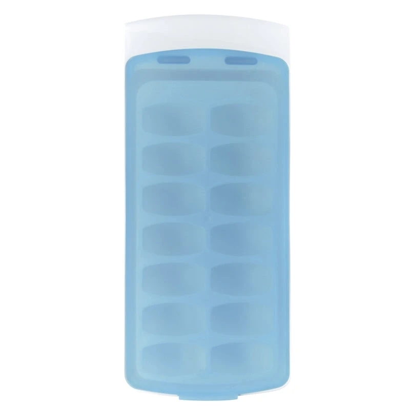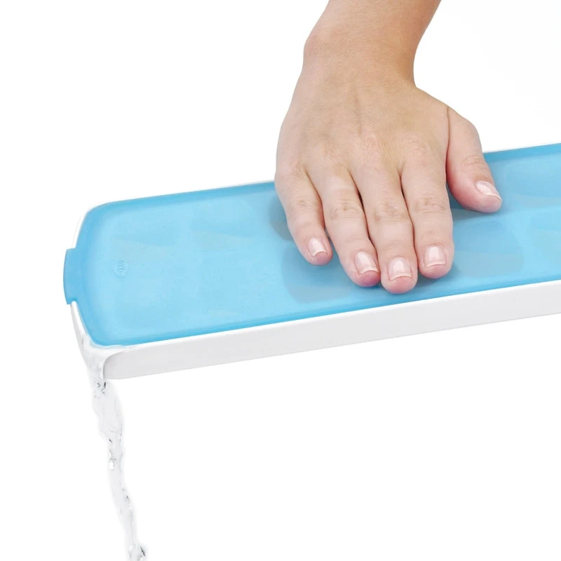 - No-Spill Ice Cube Tray, 15.5 x 5.7 x 1″H / 39 x 14.5 x 2.5cm H, plastic with silicone lid, BPA free.