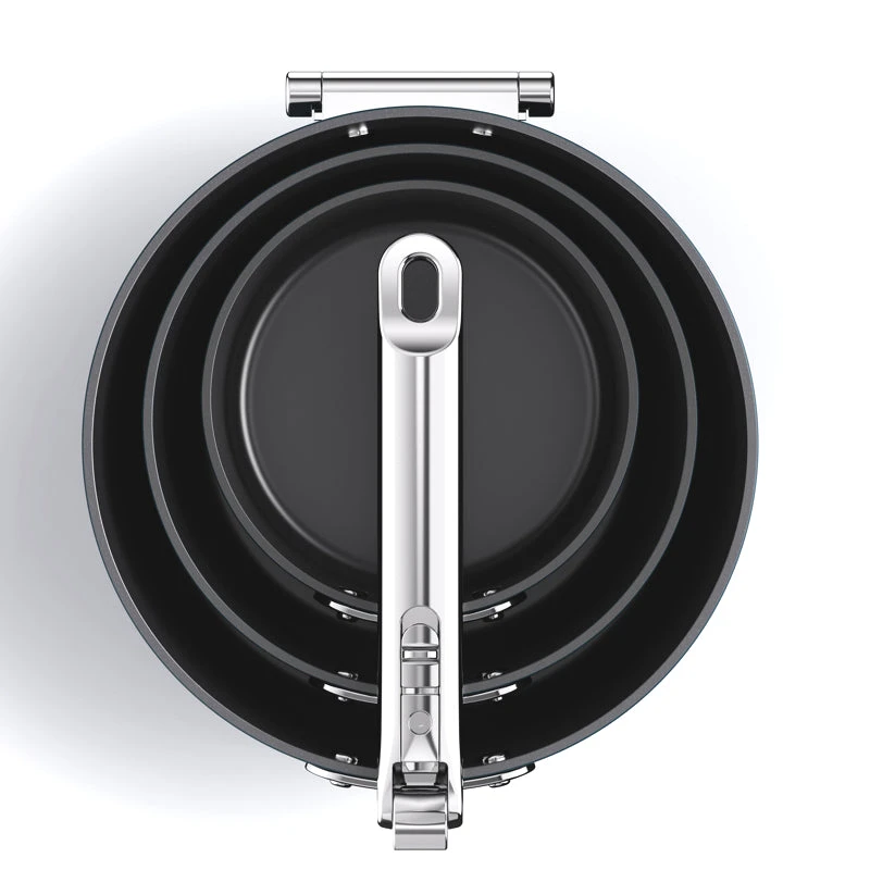 - Patented Swing Lock™, folding stainless-steel handle saves up to 50% more space than standard saucepans, when stored.